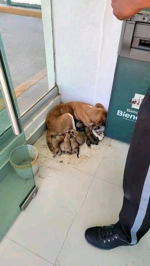 When I saw her, she was hiding her face, as if she felt ashamed. Her body was thin and exhausted, but despite everything, she was doing everything she could to protect her eight newborn puppies in that cold, public space.