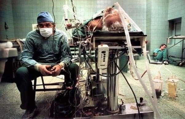 The picture captures a moment after a 23-hour heart transplant surgery. Imagine being in constant tension for 23 hours, with every movement of your arms, legs, and body holding so much pressure, knowing that a small mistake could cost someone’s life. Back then, there was no advanced equipment to monitor the doctors’ every move. The surgery was done by a highly skilled Polish heart surgeon, Zbigniew Religa.