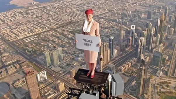 With her impeccable smile, uniform, hat and high heels, Nicole stands on a 1.2-square-meter platform on the antenna of the world’s tallest building, while an A380 commercial plane flies behind her. In total, the plane had to make 11 turns around the flight attendant, who was still smiling, to get the ideal shot.